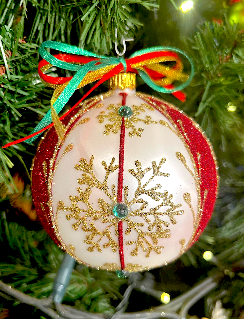 Pallina natalizia realizzata in vetro soffiato di alta qualità con diametro di 10 cm. Ogni pezzo è decorato a mano con cura artigianale, garantendo unicità e dettagli raffinati. Perfetta per abbellire l'albero di Natale con eleganza e stile classico-chic. Una scelta sofisticata per chi apprezza le decorazioni natalizie di qualità.