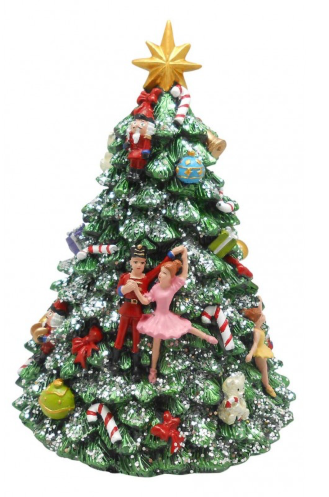 Albero di Natale Schiaccianoci. Il piccolo albero di Natale ricoperto di neve e' graziosamente decorato con articoli e regali di Natale. La coppia di ballo del Schiaccianoci completa la decorazione. Sulla punta splende una stella. Caricando il meccasnismo musicale con il dischetto alla base, l'albero gira sul disco mentre suona una melodia famosa. Misure : 16,5 x 12,5 x 12 cm.