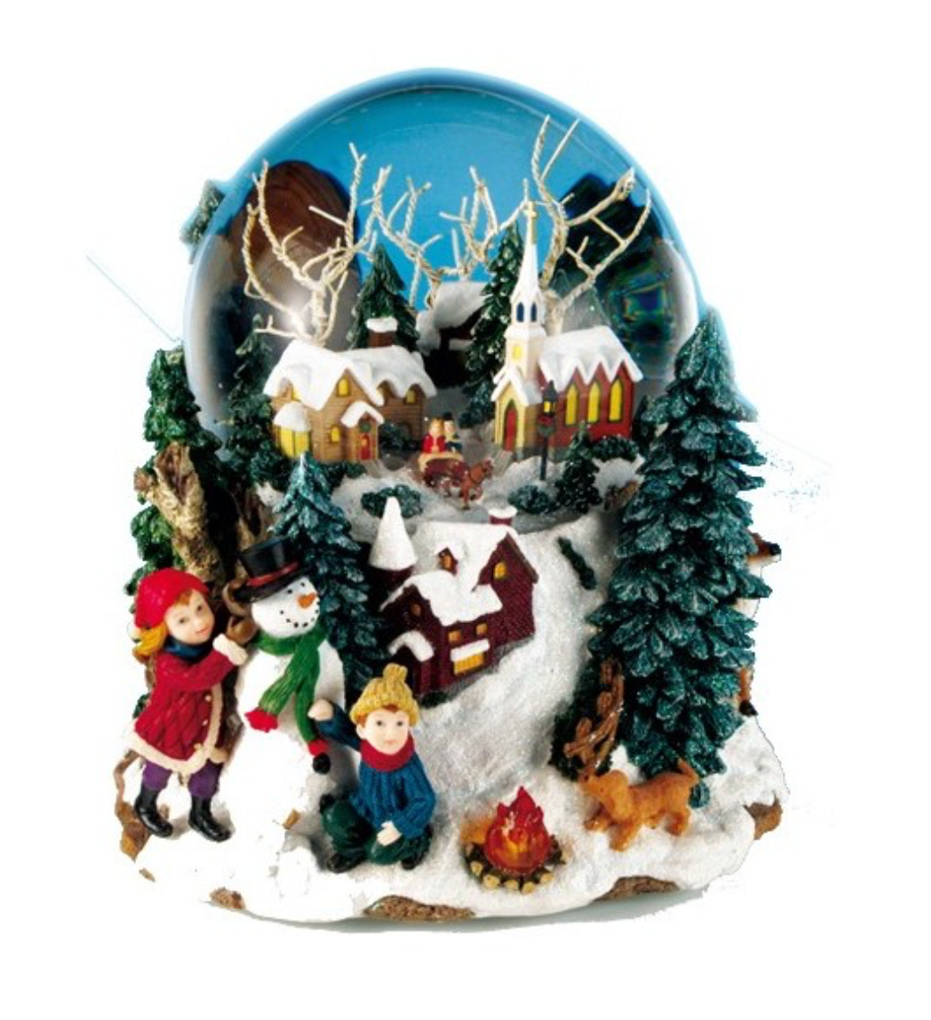 Bola de nieve musical con movimiento automático de nieve y hoguera, y casas que se iluminan. Tamaño 20x23.