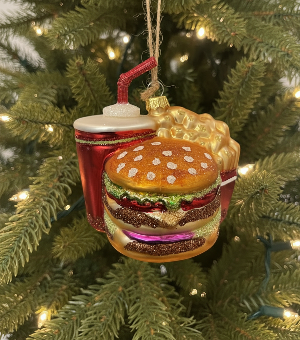 Decorazione per albero di Natale in vetro con forma di combo fast food (bibita, patatine e panino). Aggiungi un tocco di divertimento alle tue festività con questo ornamento unico e colorato. Realizzato in vetro, sarà un'aggiunta duratura e di alta qualità al tuo albero di Natale.