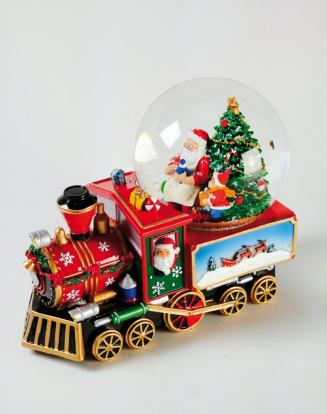 Questa elegante sfera di neve da 120 mm raffigura Babbo Natale con un bambino sull’albero, posizionati su una ferrovia che riproduce una dolce melodia natalizia. Con dimensioni di 21,5 x 12 x 17,5 cm, rappresenta un raffinato oggetto decorativo che unisce tradizione e atmosfera festiva, perfetto per arricchire con stile ogni ambiente durante le festività.