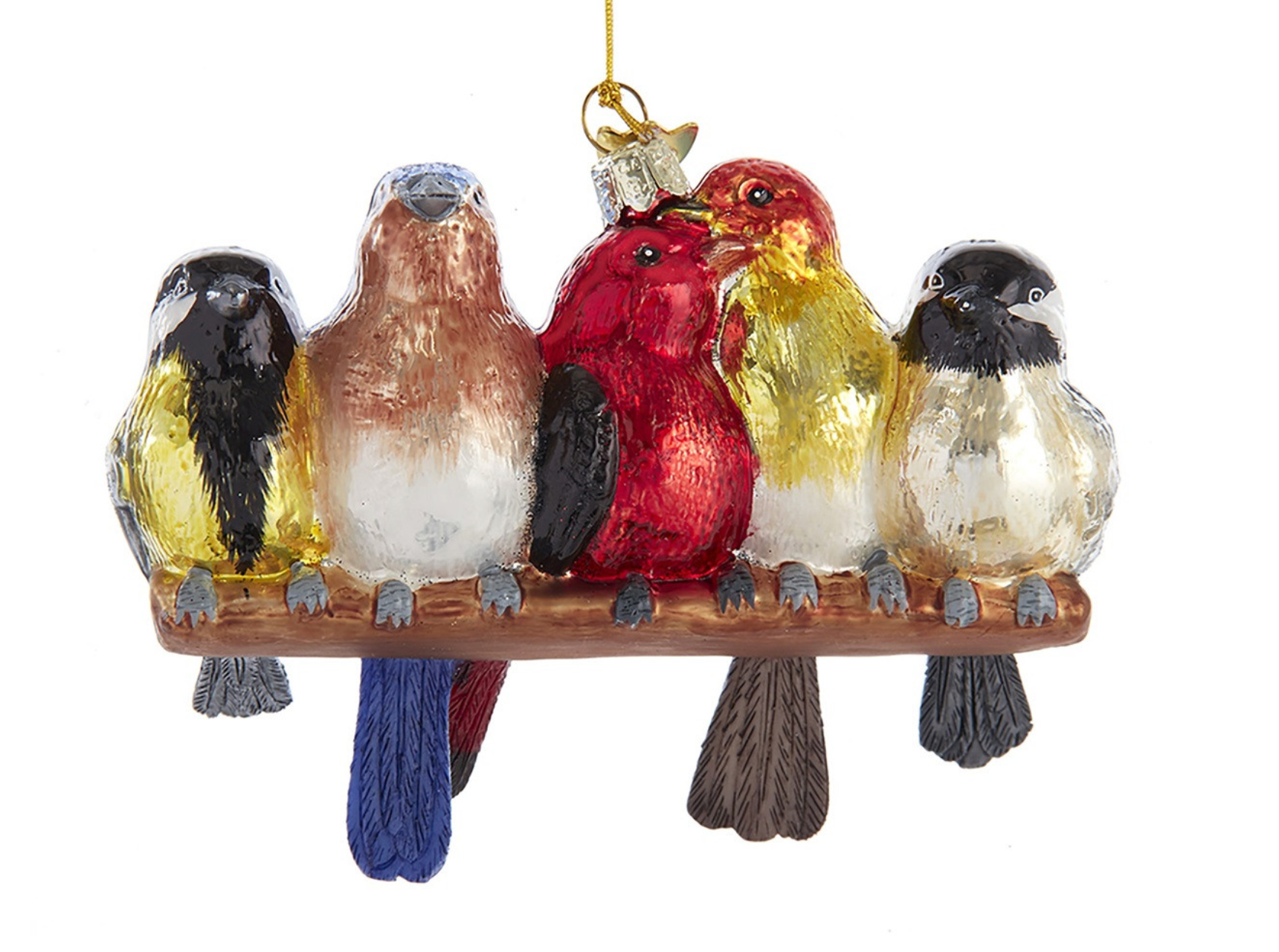Questo decoro da collezione in vetro soffiato raffigura cinque delicati uccellini posati su un ramo, un dettaglio elegante per arricchire l’albero di Natale con raffinatezza.